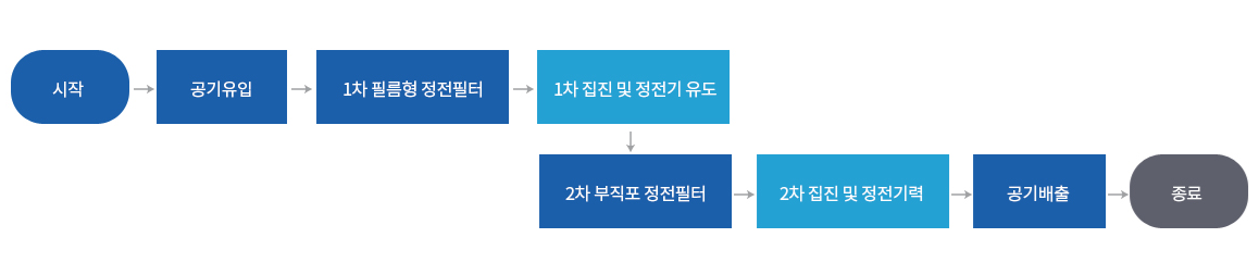 유입된 공기를 e2f필터에서 1차 필터링하여 각종 미세 입자를 정전기력에 의해 흡착하여 집진하고 미집진된 미세 입자는 필터와 입자간의 정전기 유도 현상에